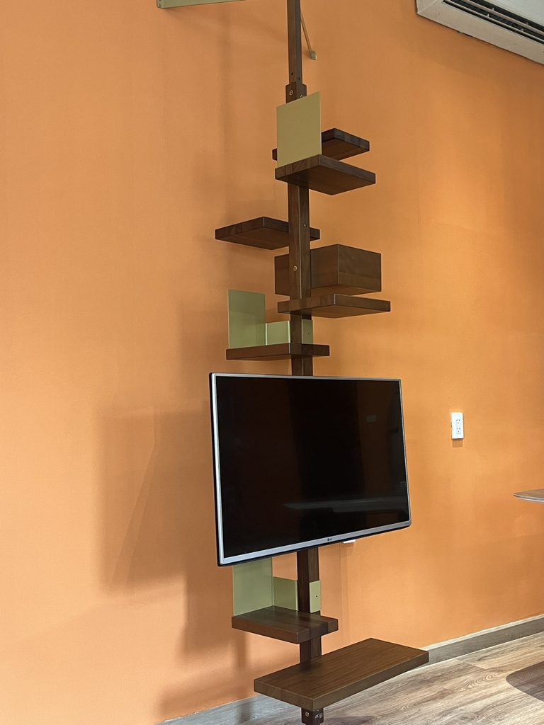 Chất liệu: Chất liệu: Gỗ Iroko nguyên khối, kệ sắt sơn vàng đồng