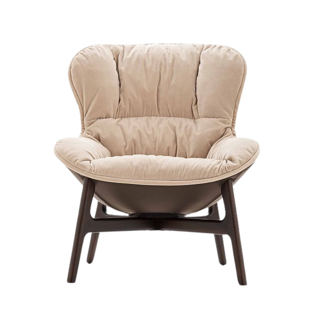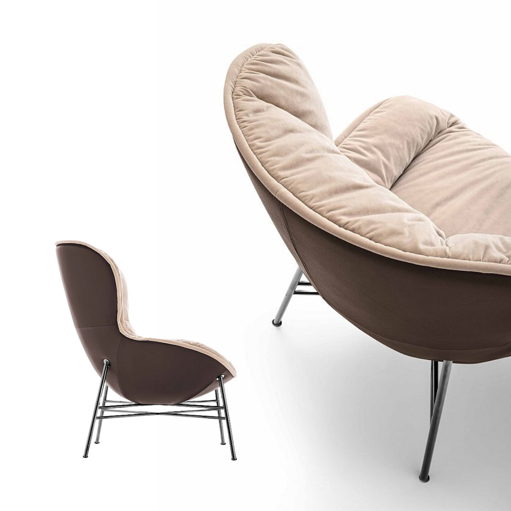 Chiếc ghế bành này có tác động thị giác mạnh mẽ, đồng thời thể hiện sự vững chắc và mềm mại. Chân đế bằng kim loại và vỏ bọc bằng da thể hiện tâm hồn cổ điển, tạo ra sự tương phản dễ chịu với phần đệm ngồi rộng rãi và tạo ra sự tương tác của các vật liệu khác nhau với kết quả rất trang nhã.
