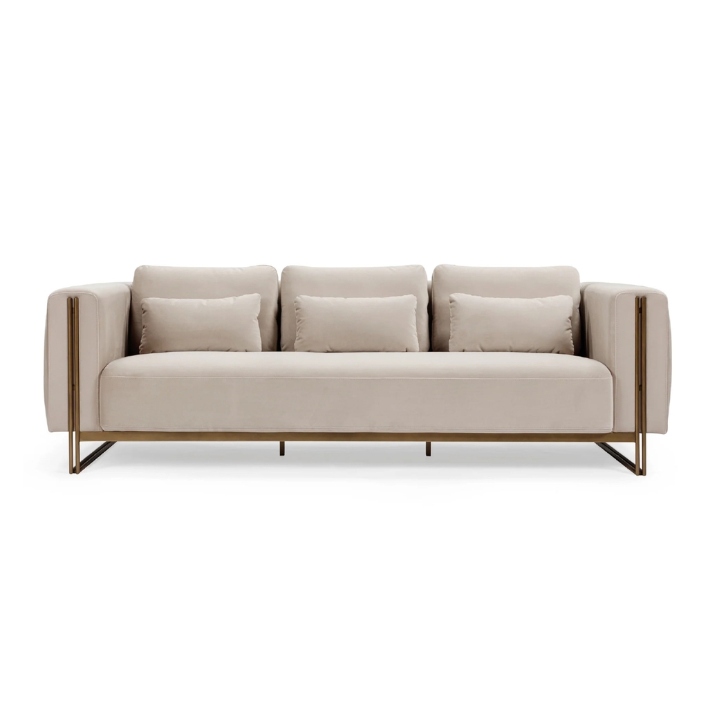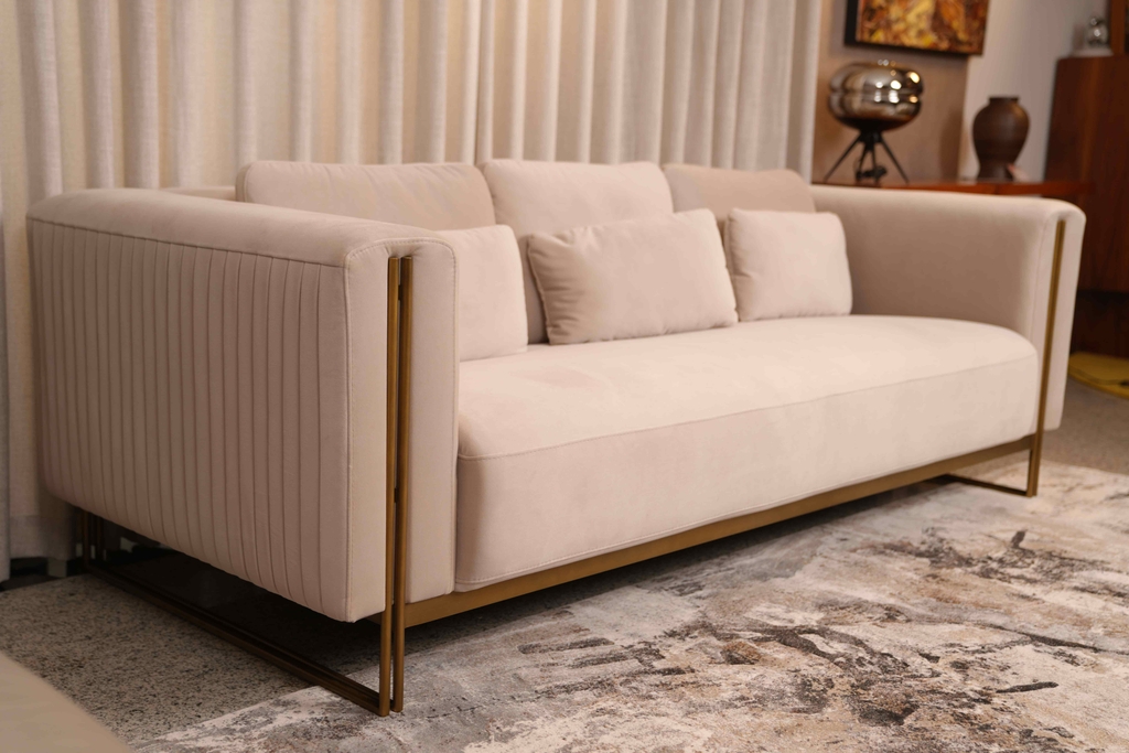 Thiết kế được định hình bởi một cấu trúc khung kim loại đồng xước bên ngoài. Phần tay tựa hé lộ một chi tiết đầy bất ngờ: những đường xếp ly dọc tinh xảo ở mặt ngoài, mang lại một dấu ấn cổ điển và nghệ thuật cao cấp.