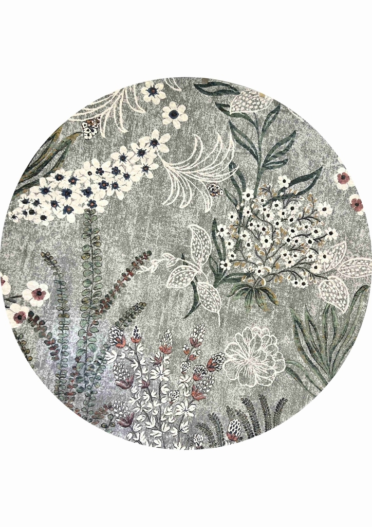 Thảm hoa văn tròn Ragolle 7676 nổi bật với thiết kế lấy cảm hứng từ thiên nhiên, mang sắc xám trung tính làm nền, điểm xuyết các họa tiết hoa lá mềm mại, tinh tế. Các nhành hoa với gam màu trắng, xanh, hồng và tím nhạt được dệt tinh xảo, tạo cảm giác vừa trang nhã vừa sinh động.