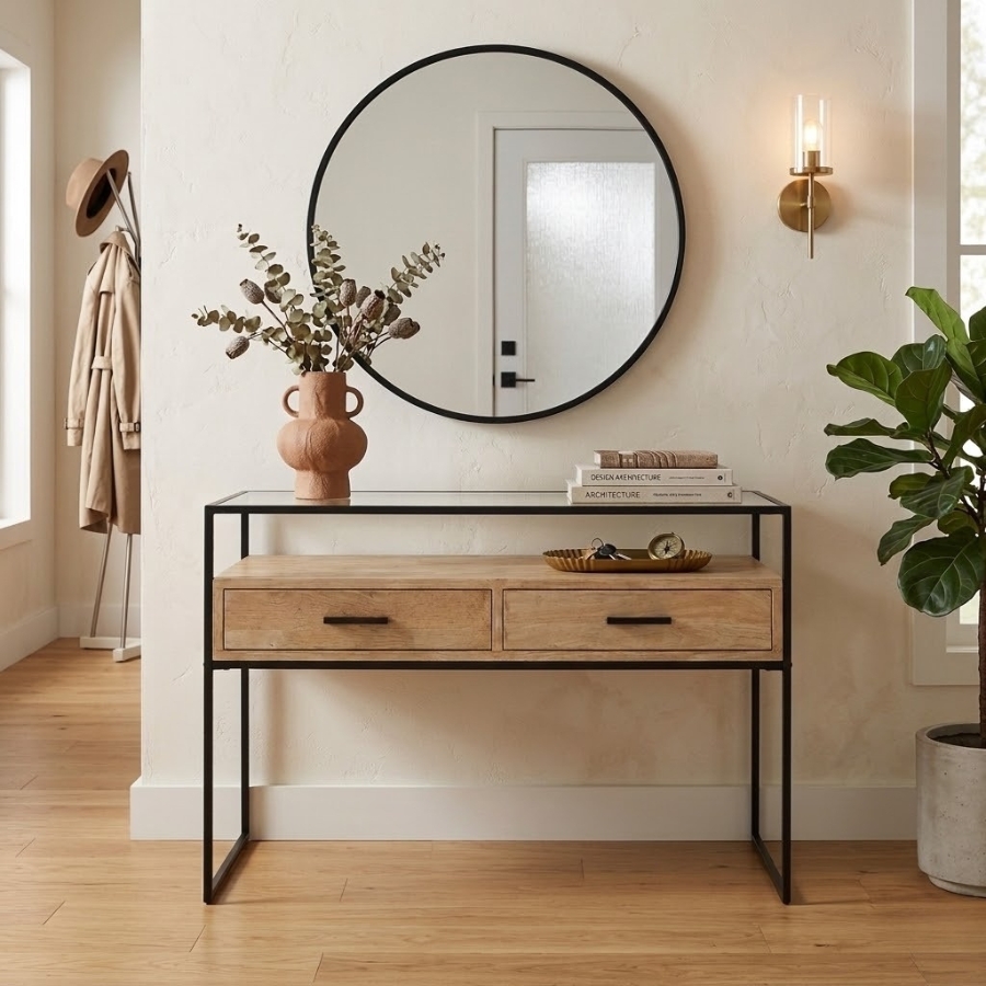 Tủ console W1000 X H950 X D400 MDF MELAMIN AN CƯỜNG, KHUNG SẮT SƠN TĨNH ĐIỆN + MẶT KÍNH